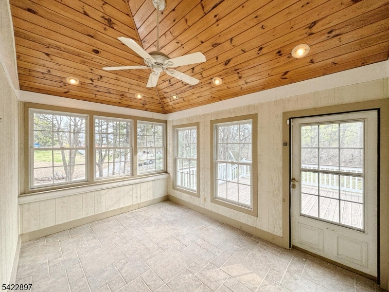 Welcome to this beautifully updated 3-bed, 2-bath ranch on a private dead-end road, set on a stunning one-acre naturally landscaped lot just one hour from NYC. Featuring over 2,300 sqft of finished space, step inside to abundant natural light and refinished hardwood floors throughout. The showstopping kitchen boasts new luxury two-tone slim shaker cabinetry, skylight windows, quartz countertops & backsplash, and stainless steel appliances. The dining room impresses with soaring 12 feet vaulted ceilings and walls of windows. French doors open to a gorgeous year-round sunroom flowing onto a massive wraparound deck, perfect for entertaining. Cozy up by the wood-burning fireplace in the spacious living room. The primary suite offers generous closet space and a private full bath. The finished ground floor features an expansive open recreation room ideal for entertaining, a home gym, or multigenerational living, plus a dedicated laundry room. Car enthusiasts will love the oversized 2-car garage, an impressive 30 feet deep with a workshop room! A walk-up attic adds even more storage and expansion potential. Central A/C & baseboard heating. A natural creek winds through the private backyard, a peaceful retreat year-round. Space, privacy, and modern comfort. Don't miss your chance!